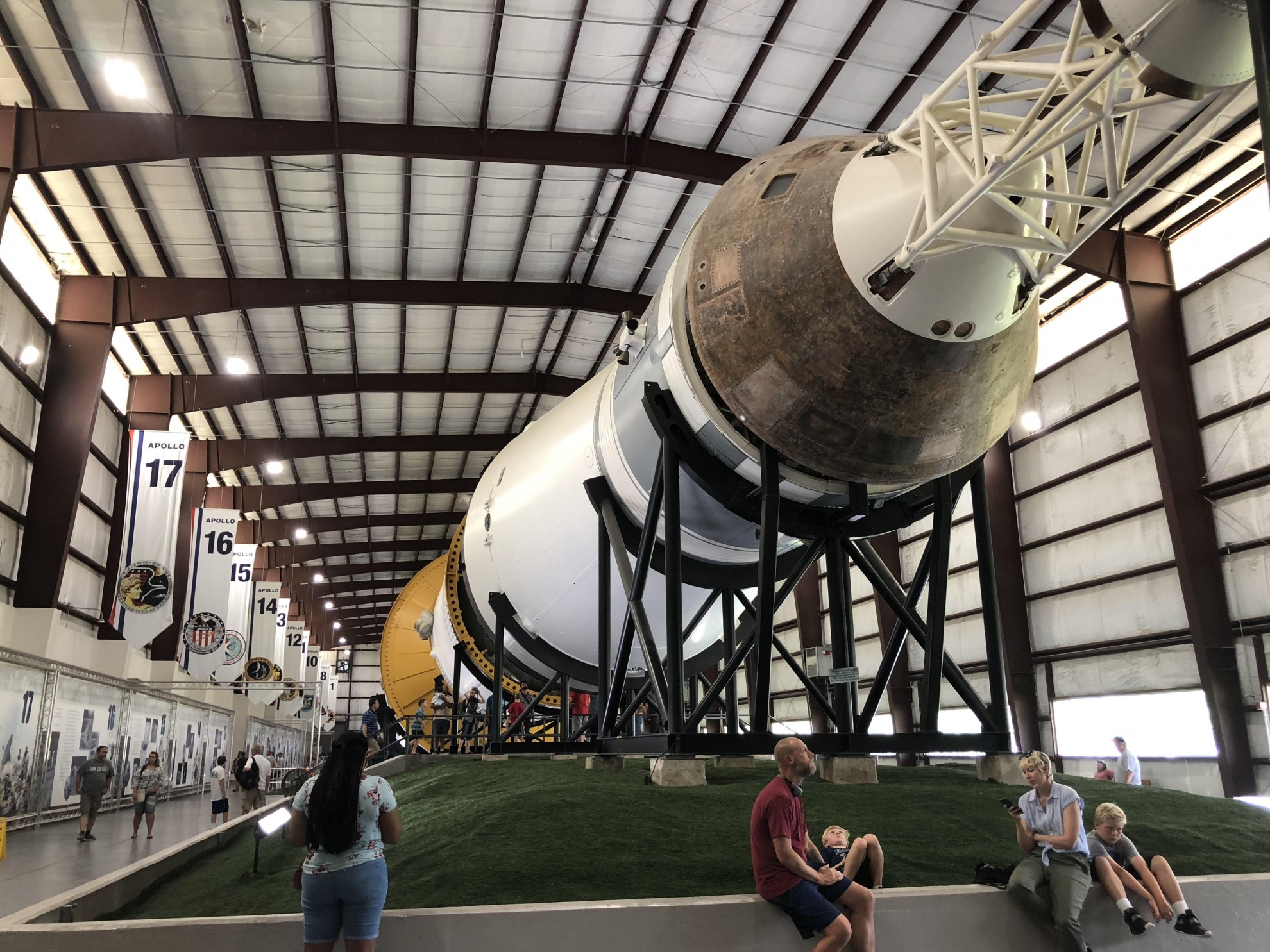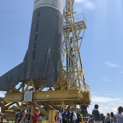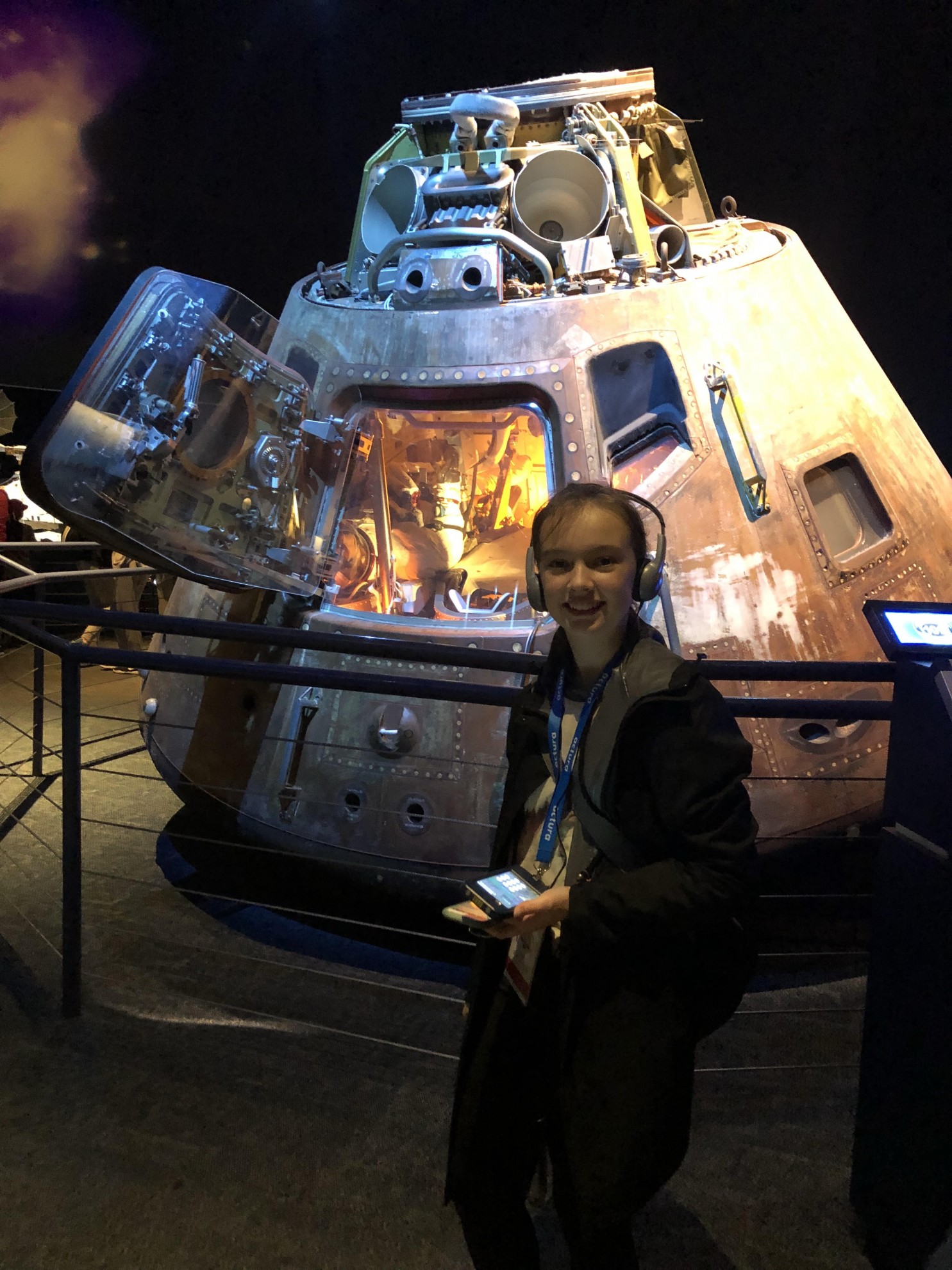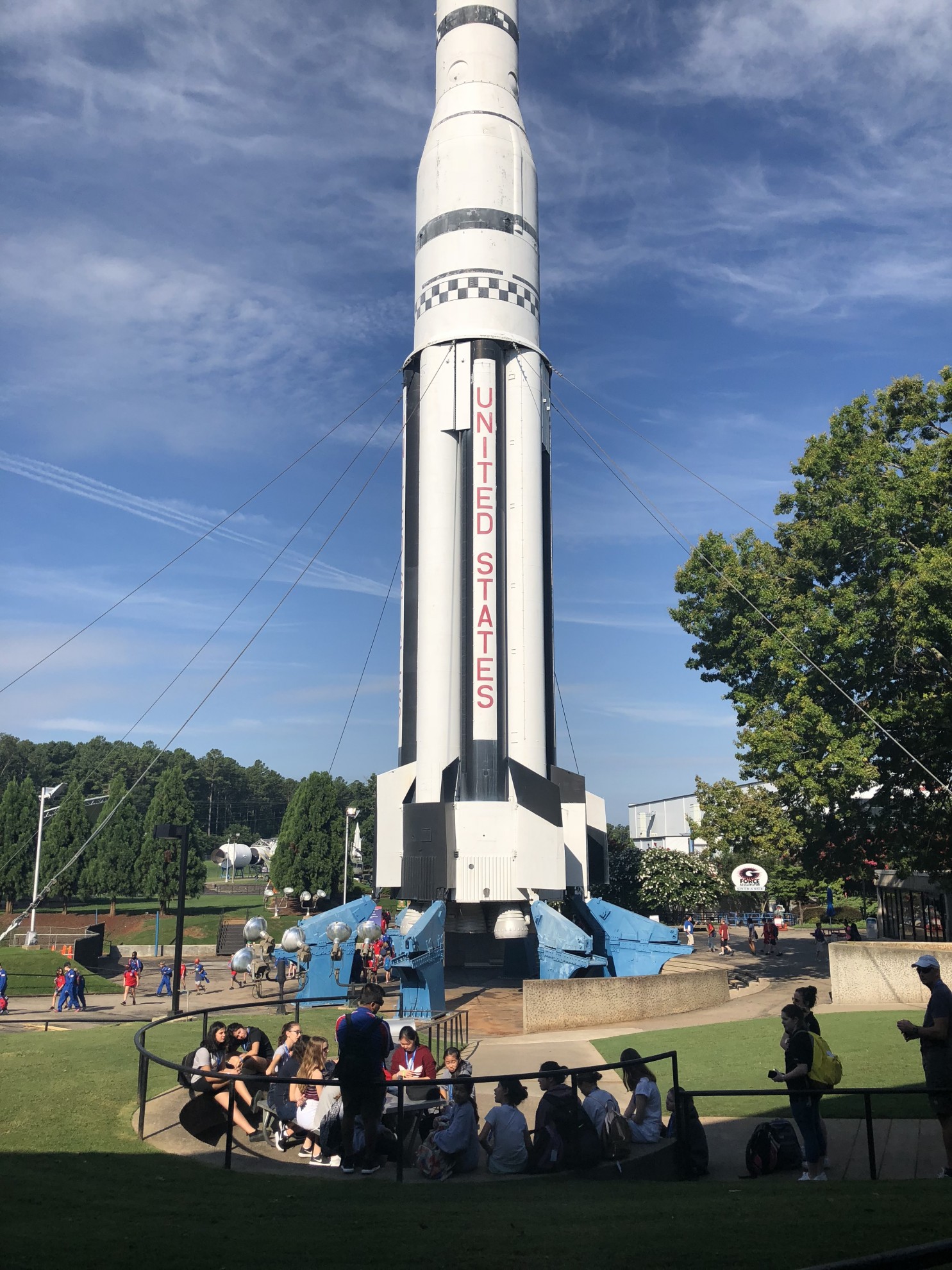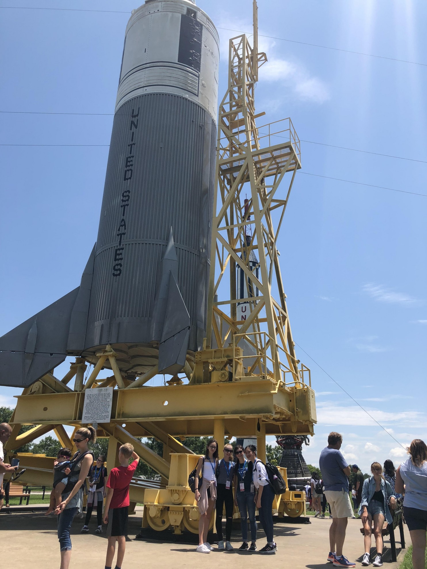 After lunch, we hopped on a tram for a tour of the campus, continuing on from our visit on Wednesday. This time, we travelled to the original Apollo Mission Control Centre which was operated in the 1960s, from which all historic communication with Apollo astronauts occurred. We could see the control room through the glass from the VIP viewing box, which was a section reserved for invited guests to watch the mission control live. The centre, which is still fitted with some of the original computers used, received the famous words, “One small step for man, one giant leap for mankind” alongside all other communication for the Apollo missions. We then headed to Rocket Park, in which, among other rockets, the Saturn V is on display – the huge rocket used in the Apollo space missions to the moon. It was very exciting to be so close to the rockets and read about each of the Apollo moon missions.